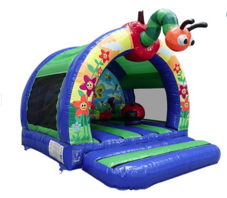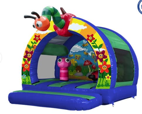 Crafted with a cute curved roof, this original and unusual bugs bouncy castle for hire is covered in smiling flowers all over the entrance and on the back wall. They’re welcomed in by a 3D ‘hungry, hungry caterpillar’, eating his way out of an apple, and inside there’s a red ladybird and a pink wiggly worm to play with too.