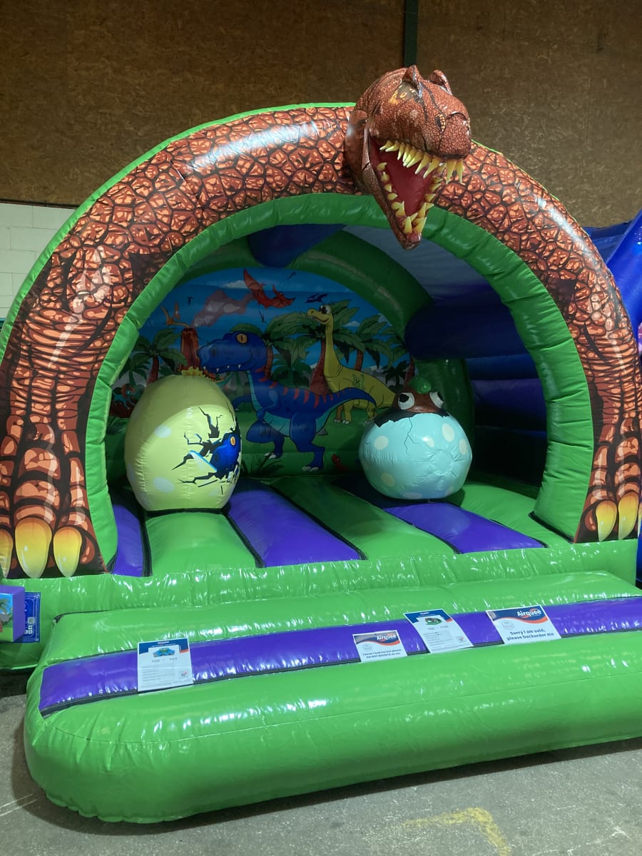 The cute baby creatures are about to hatch in this dazzling dinosaur bouncy castle.